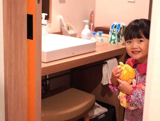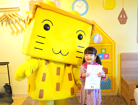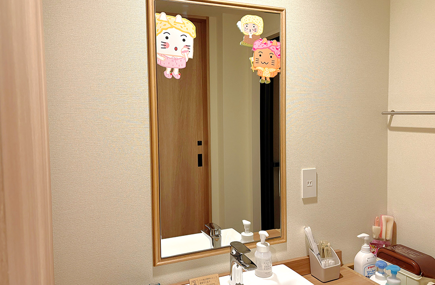 シャワーブースへ続く扉ののれんと鏡にはボザッピィファミリーもいます。ボザッピィに囲まれた客室に、大満足の様子のまなつちゃん。一通り探検をしたら、ボザッピィグッズと認定証のプレゼントを行い、記念撮影をしました。この写真も、まなつちゃんの宝物の1つになれば嬉しいです。