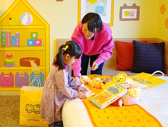 「箱根ホテル小涌園」に到着後、スタッフに大きな声で挨拶してくれるまなつちゃん。ご両親、生まれたばかりという妹のいちかちゃん(仮名)と一緒に、念願の「しかっくんのおうち」へ向かいます。「今日は保育園で、じゃんけん列車をやったの!優勝したんだよ!」と元気に教えてくれるまなつちゃん。スタッフ一同、その無邪気な笑顔に元気をもらいました。
