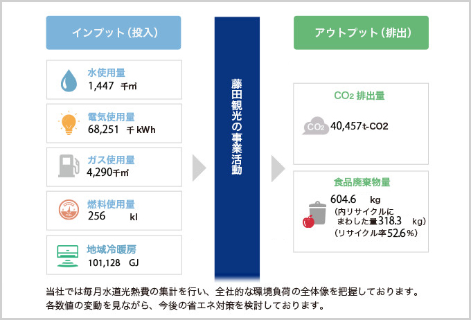 - 藤田観光は、宿泊・レストラン・宴会・婚礼・レジャーの各事業を通じ、健全な憩いの場と温かいサービスを提供しております。私たちは、人々が将来にわたり安全で、楽しく、豊かな時間と空間を過ごしていただくことができるよう、環境負荷の低減と循環型社会の形成に向け、人と地球に優しい企業市民を目指します。