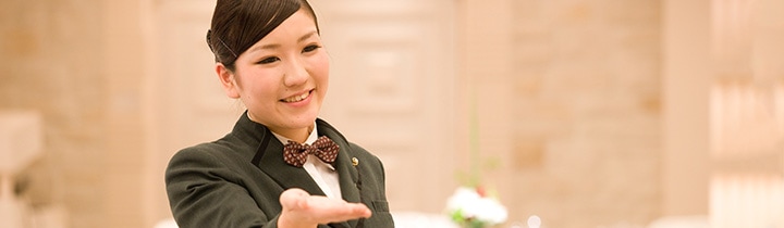 各種宴会の会場設営、備品管理、運営等の準備段階から当日の接客・配膳まで幅広く担当。宴会を予定通りに進行させるために欠かすことのできない存在です