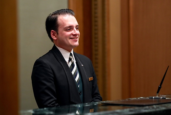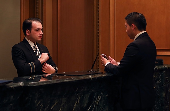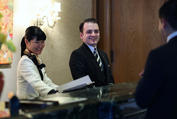 ベルスタッフの主な仕事は、ホテルにご到着したお客様のお出迎え、客室へのご案内、お見送り。また、手荷物をお預かりするなど、お客様の様々なリクエストに対応します。また、ベルデスクは、お客様のリクエストを受ける窓口として、ベルスタッフに仕事を割り振り、指示を出しながら、リクエストに的確に対応していきます。さらに、夜勤時のベルデスクの重要な仕事として、ホテルの全部署のスタッフが日々使うゲストリスト、イベントリストの作成があります。リストの内容は、レストランの予約状況、施設内イベント情報、クローク情報、VIP情報など。これによりホテルの部署間の連携が取りやすくなります。