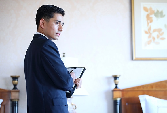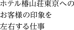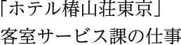 客室サービス課の仕事には、ゲストリクエストランナー業務とスーパーバイザー業務があります。ゲストリクエストランナー業務は、お客様からのリクエストに応じて、客室備品サービスの対応、ランドリーサービス対応など、接客業務を行うこと。スーパーバイザー業務は、清掃した部屋のチェック、ルームアテンダントへの指示、部屋のメンテナンス依頼を行うことです。そのミッションは、お客様にホテル椿山荘東京の客室を、最高の水準で堪能していただくことです。