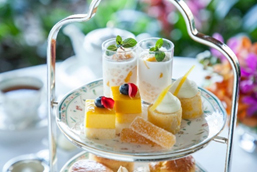 ロビーラウンジ「ル・ジャルダン」では、7月より「ピーチアフタヌーンティー」が登場します。上段には、赤・黄・白3種類の桃を贅沢に使用したジュレ、ムース、タルト、フィナンシェをご用意。味・香り・食感でフルーティーな桃をご堪能いただけます。