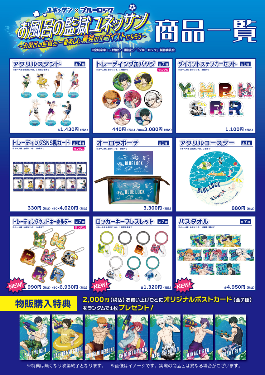 主人公「潔 世一」をはじめとした人気キャラクター7人が水着でユネッサンを遊び尽くしている姿を特別に 描き下ろしたキャラクターのバスタオルや、各キャラクターの水着姿をデフォルメしたデザインを落とし込んだ ロッカーキーブレスレット(全7種)、トレーディングウッドキーホルダー(全7種ランダム)の全3種を販売いたします。さらに、前半戦に続き、物販購入特典として2,000円お買い上げ毎にオリジナルポストカード全7種からランダムで1枚プレゼントいたします。
