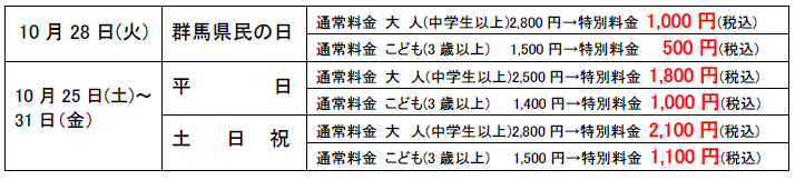 10月に入ってから朝晩は肌寒くなり、秋の訪れを感じている群馬県民の皆さまも多いのではないでしょうか?そこでユネッサンは、群馬県民の皆さまのお出かけ意欲を後押ししたいと考え、10月28日(土)の「群馬県民の日」に合わせて「勝手に群馬県民割!」を実施いたします。