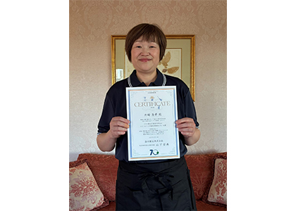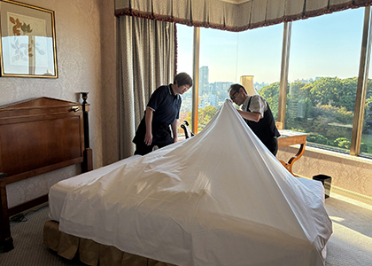 旅館の料飲部門で働いている中で、高級ホテルのスイートルームに興味を持ち、徹底された清掃はどのように行われているのだろうと疑問を持つようになったとのこと。当日は清掃のプロの熱血指導のもと、細かいチェックポイントを確認しながらベッドメイキングなどをリアルに体験していただきました。