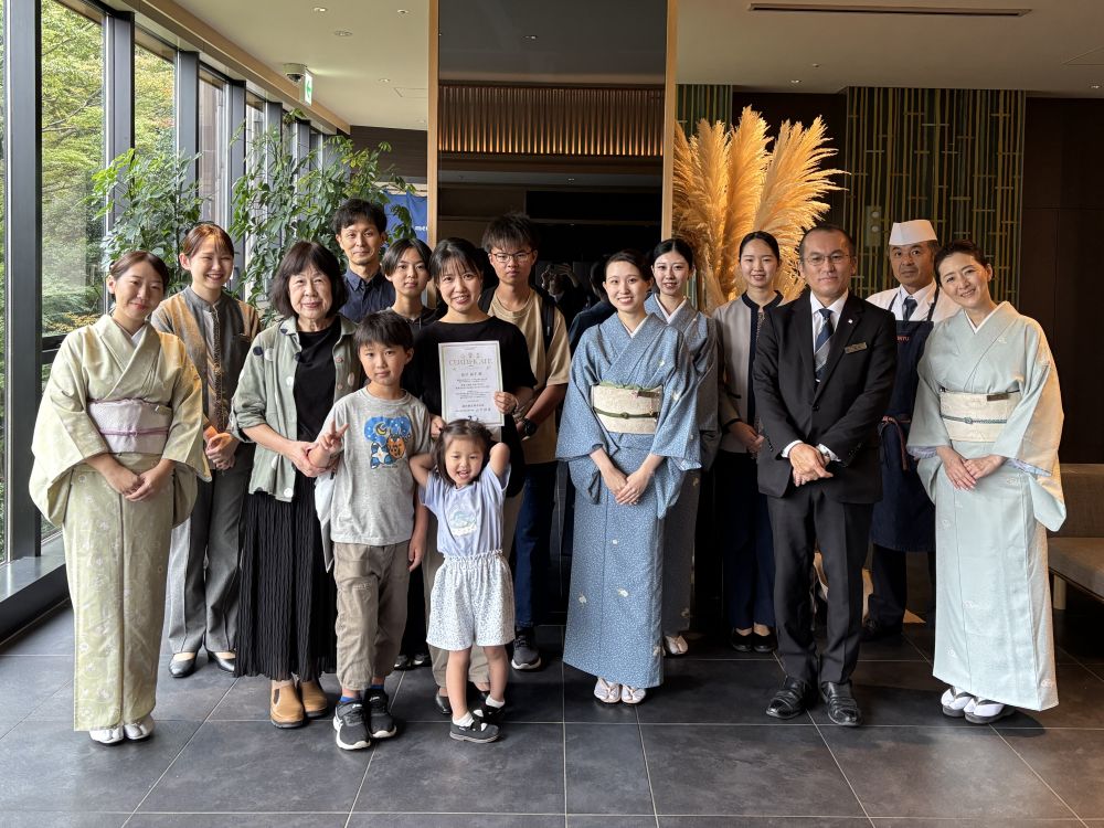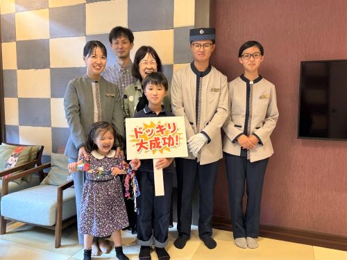 何万人にひとりしかいないと思うくらい、優しさに溢れるお義母さまの「箱根の温泉に行ってみたい」という希望を叶えたいというご家族の夢。スタッフの制服を着たご家族がドア係、チェックイン係、