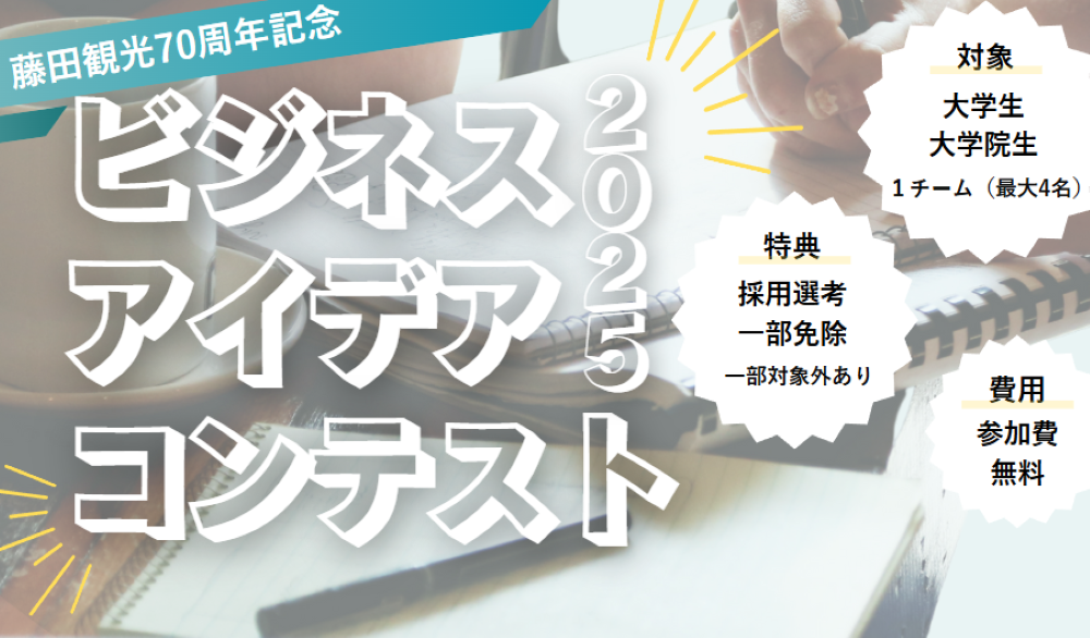 70周年を契機にさらなる飛躍を目指し、持続可能な成長を追求していくため、大学生・大学院生を対象に、藤田観光が次代を見据えて取り組むべき新規事業案を募集しています。学生ならではの柔軟な発想や豊かなアイデアで企画した、ユニークな事業提案をお待ちしております。
