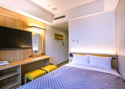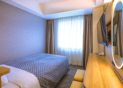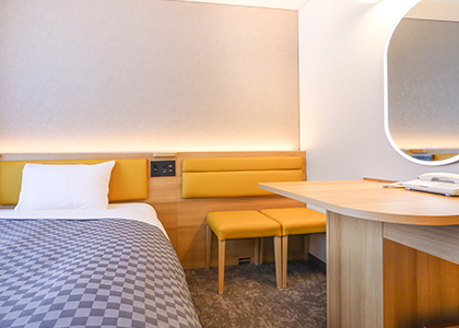 当ホテルの客室は、より快適で過ごしやすい空間づくりを目指し、温かさと利便性を兼ね備えたデザインに生まれ変わりました。リニューアルした客室には4つの特徴があります。1つ目は、「暖色系を基調とした温かみのある空間」です。やわらかな光に包まれ、心身の疲れを癒しながらリラックスしたひとときをお過ごしいただけます。2つ目は、「壁掛けタイプのテレビ」の採用です。デスク周辺のスペースを確保し、より広々としたレイアウトを実現いたしました。3つ目は、「LEDライト付きミラー」を設置したことです。明るさと見やすさにこだわったカラーを採用し、朝の身支度やお化粧がよりスムーズに行えるようになりました。最後に、「シンプルで洗練されたインテリア」を採用しました。無駄をそぎ落したデザインが空間の広がりを演出し、快適な居住性を実現します。