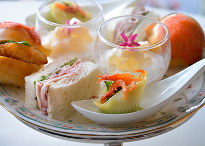 まずアミューズには、なめらかなじゃがいものスープに、鯛ブランダードのコロッケを合わせた「鯛ブランダードのコロッケとパルマンティエ」をご用意。続く三段スタンドの各プレートには、それぞれに趣向を凝らしたメニューを揃えました。