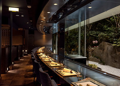 当店は、新宿の喧騒を忘れさせる落ち着いた大人の雰囲気の中、神戸牛や米沢牛、伊勢海老、鮑などの厳選素材を鉄板焼で愉しめます。ライトアップされた中庭を望むカウンター席では、シェフが目の前で素材を焼き上げる迫力ある鉄板さばきをご覧いただけます。