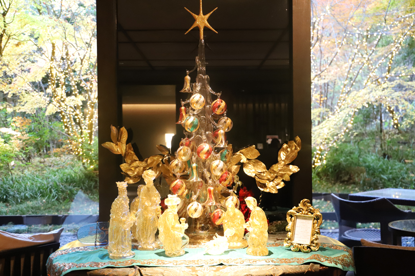 本コラボレーションでは、箱根ガラスの森美術館が所蔵するヴェネチアン・グラス作品やガラス製ツリーオブジェに加え冬を象徴するガラスの“プレゼピオ”を「天悠 The Bar & Lounge」で展示しています。“プレゼピオ”は中世ヨーロッパではクリスマスツリーと並ぶ重要な飾りとして、季節の厳かな空気を象徴する存在です。紙や木、陶器など多様な素材で作られてきましたが、19世紀頃より、ムラーノ島ではガラスによる聖人形が制作され、その伝統美が今日まで受け継がれています。クリスマスの時期には、小さなガラス人形が温かな物語を感じさせるシーンを演出し、展示空間に趣を添えます。