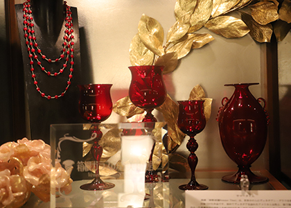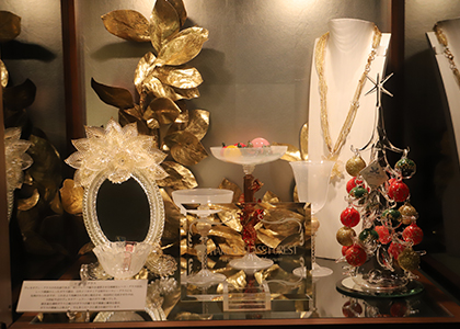 店頭のショーケースには「レース・グラス」「ヴェネチアン・グラス」等を展示しており、飾られている商品の一部は箱根ガラスの森美術館ショップにてお求めいただけます。