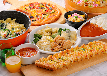 ◎メニュー例 苺、パイン、グレープフルーツルビー、オレンジ、和菓子各種、スイーツ各種、ホワイトチョコレートファウン テン、ソフトクリーム、パン各種、サラダバー、ハヤシライス、ピザ、たけのこ山菜ご飯、山芋梅しそ巻、ミネス トローネ、ミニハッシュドポテト、からあげ、ほうれん草とベーコンのペンネ、ソフトドリンク、ワインなど