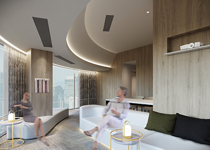 スカイレジデンスルームは、25階建てホテルの24階に位置しており、広さは約96㎡。客室の窓からは新宿の街並みを一望でき、煌めく夜景や都心の絶景を楽しむことができます。広々とした快適な空間は、温かみのあるウッド調のインテリアと大きな窓から差し込む自然光が、落ち着いた心地よい空間を演出いたします。