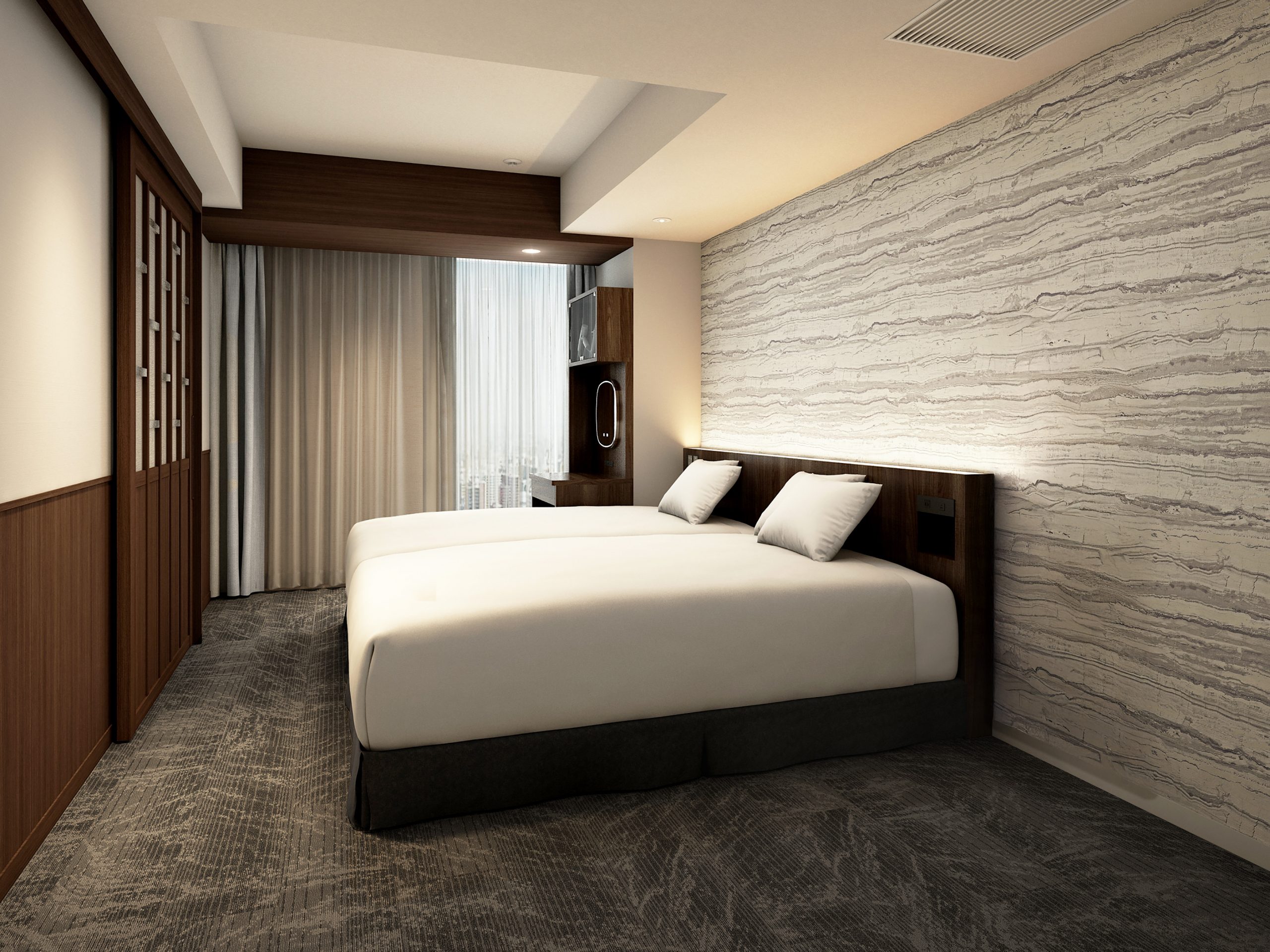 このたび、ホテルグレイスリー札幌の高層階エグゼクティブフロアに「デラックスツインルーム」32室が誕生いたします(うち16室は2月完成予定)。客室面積30㎡のゆったりとした空間設計に、北海道の景観の美しさを物語として体験していただけるよう、「雪景色」をテーマにした空間デザインを採用。厳冬を象徴する“吹雪”をデザインモチーフにした客室タイプでは、濃淡の木製家具をバランスよく配置し、吹雪の中の温もりを感じられる空間に仕上げています。