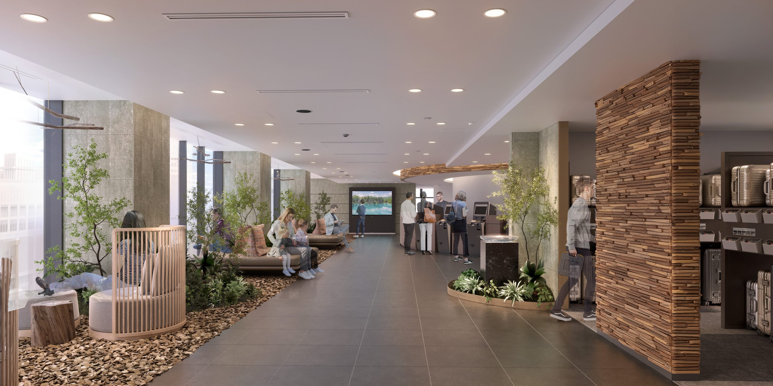 床には道南・厚沢部町のウッドチップを敷き詰め、自然の香りとともに静かに響く水音が心を穏やかに落ち着かせてくれます。大きな窓からは季節ごとに移ろう札幌の街並みが広がり、差し込む光の揺らぎが心地よい開放感を演出します。さらに、新設のリラックススペースでは、靴を脱いで旅の疲れをほどく、穏やかでやさしい時間をお過ごしいただけます。木の香り、植栽の緑、水の音、光の表情など、自然が奏でるさまざまな“感覚”に寄り添うこのロビーで、北海道の魅力を心で味わうひとときをお楽しみください。
