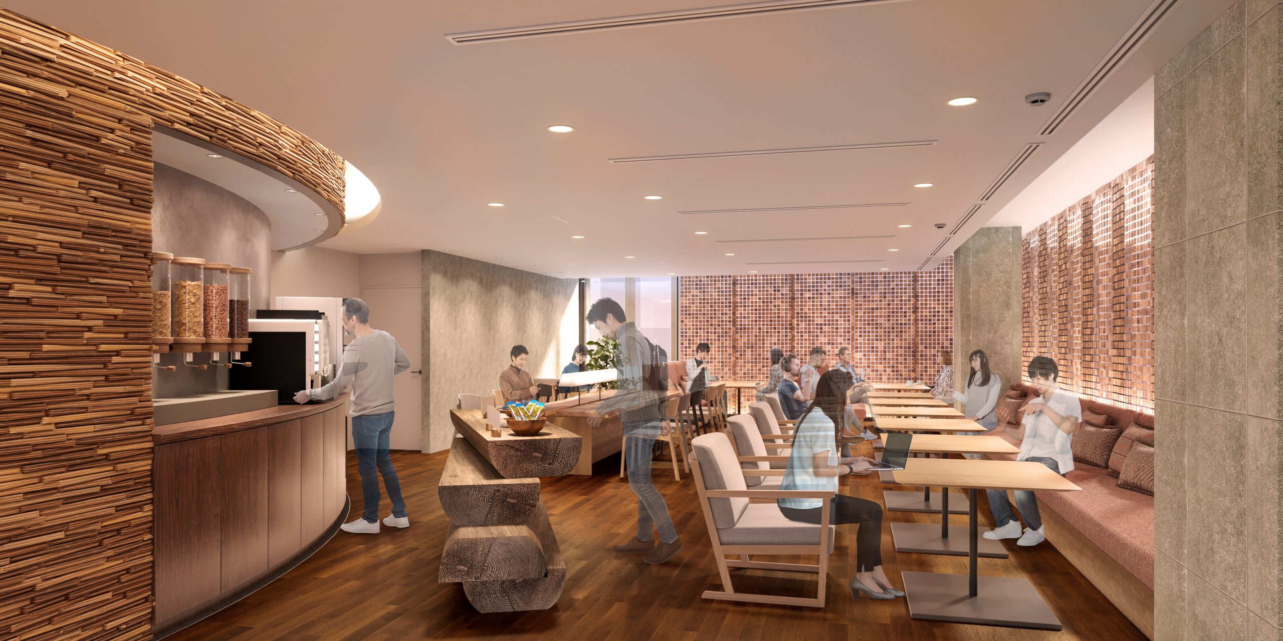 空間デザインは木の質感を基調に整え、やわらかな照明が落ち着いた雰囲気を演出しています。入ってすぐの位置に配された、道南・今金町から運ばれた長さ2mを超える丸太のテーブルは、堂々とした存在感を放ちつつも、自然のぬくもりを感じられるしつらえです。そんな穏やかな空間の中で、旅の思い出を語り合ったり、翌日の予定をゆっくりと考えたりと、心がすっと軽くなるようなひとときをお過ごしいただけます。