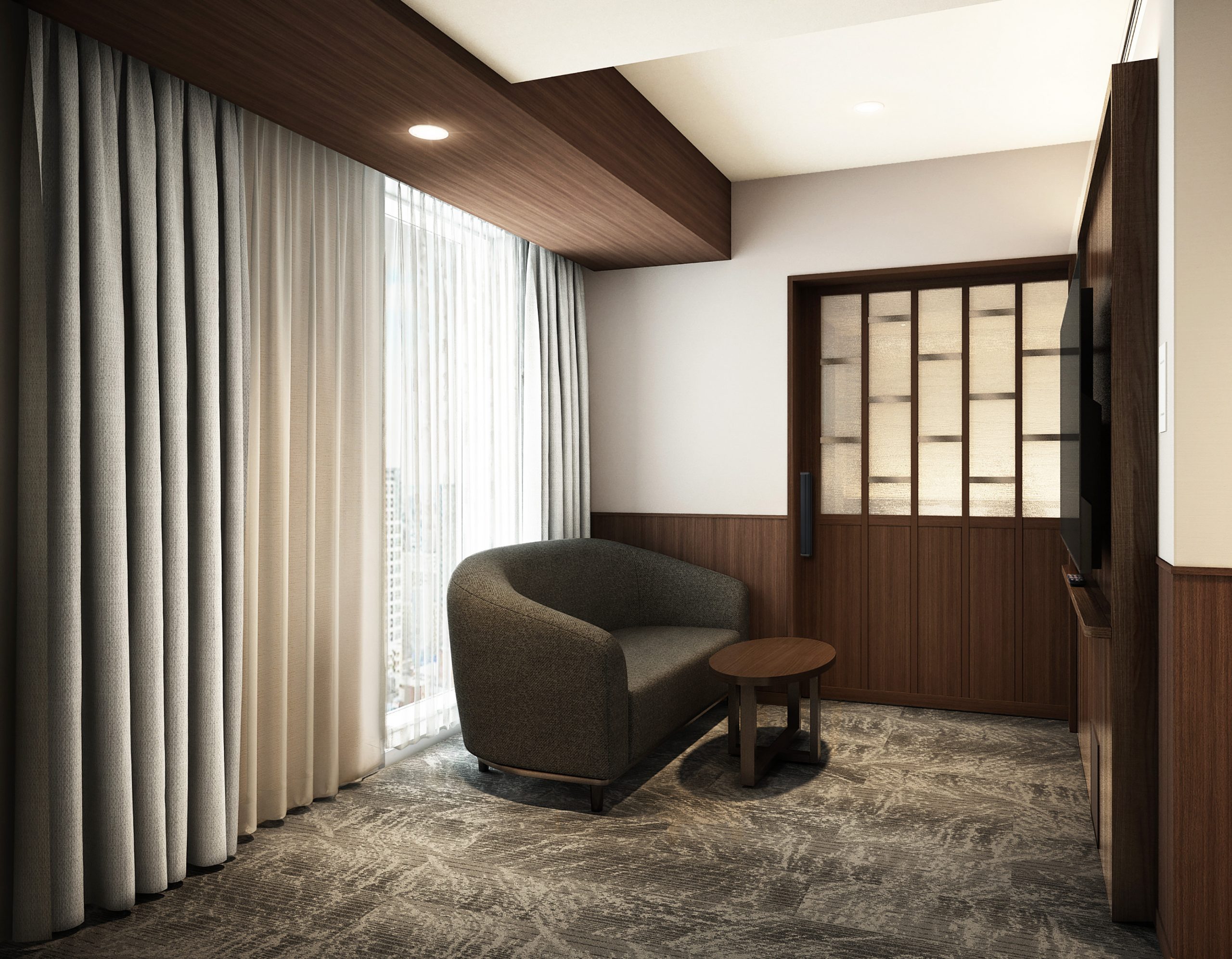 当客室は、ホテル内で最大の「30㎡」の広さを誇り、シングルルーム2室を繋げる形で改装を行ったことで、ゆったりとした空間設計を実現しました。札幌の景観色「吹雪」は、「北海道の厳冬を象徴し、雪があらゆる方向に舞い、空へ吸い込まれていく様子」を表現した色調です。床材にはこの「吹雪」をイメージしたデザインを採用し、光沢感のあるアクセントクロスと組み合わせることで、重厚感と深みのある空間を演出しました。濃淡をつけた木製家具をバランス良く配置し、厳冬の中にも温もりを感じられる落ち着いた雰囲気に仕上げています。