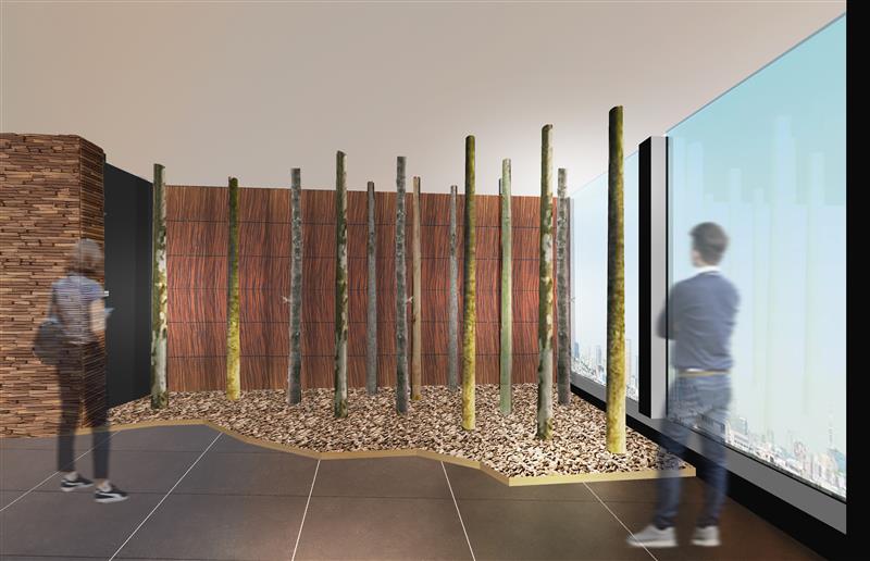 ロビーに一歩足を踏み入れると、札幌の大地で育った木々の香りがふわりと広がり、まるで北海道の森に迷い込んだかのような没入感に包まれます。使用している木々は、札幌の里山地域である西区小別沢から運ばれたもので、桑の木やカエデなど5種類が並び、豊かな表情を空間に添えています。